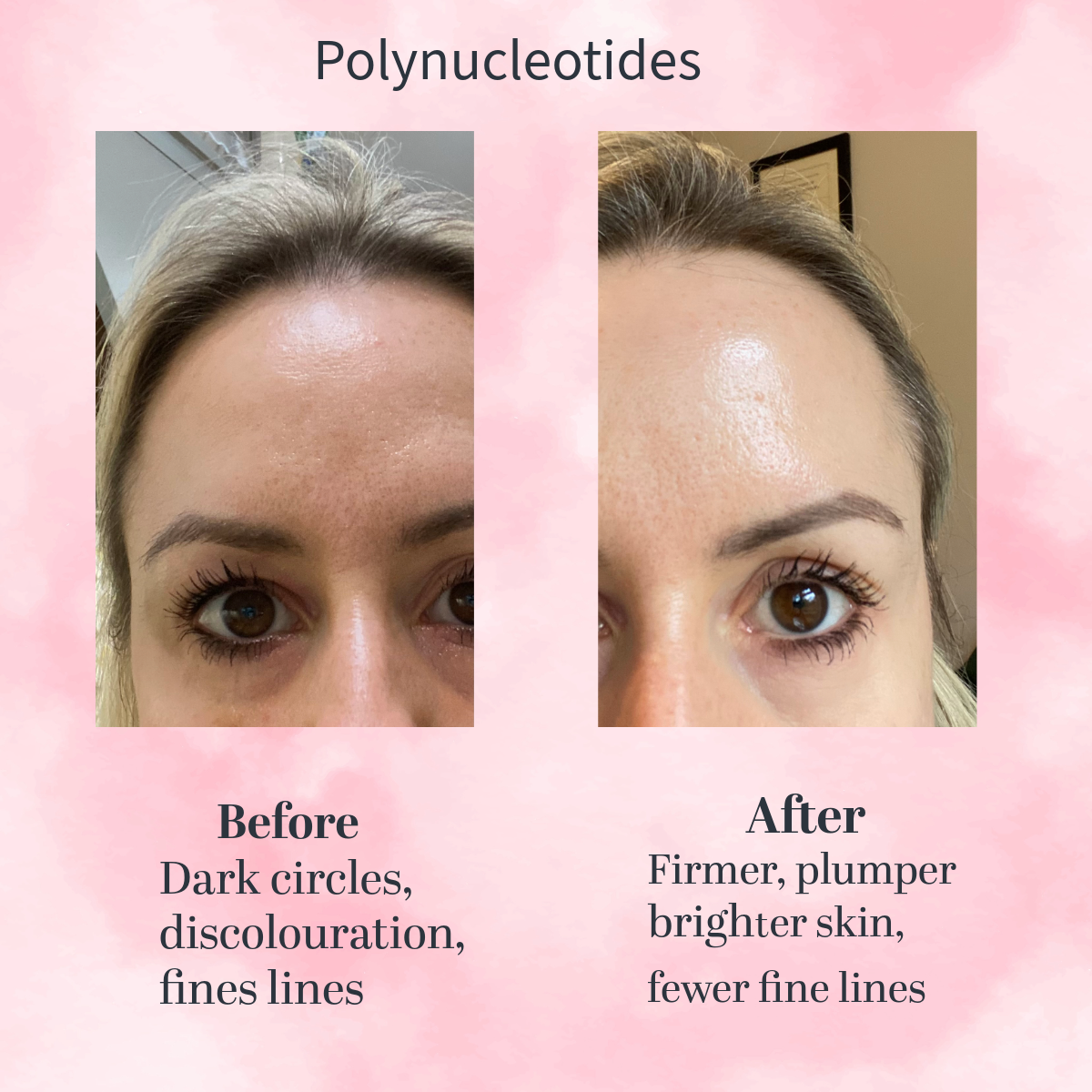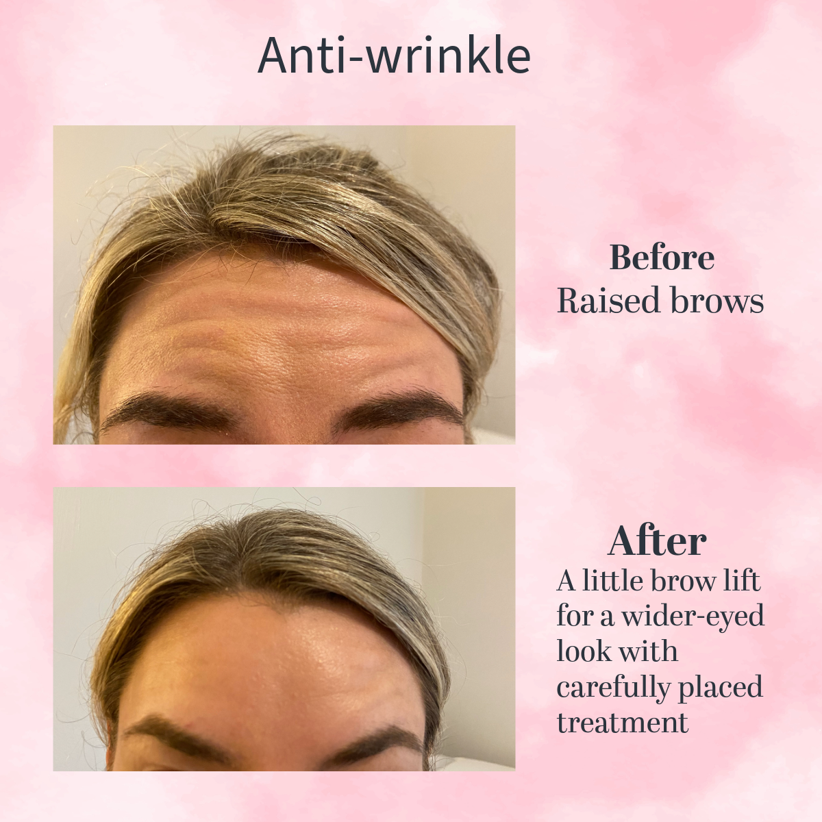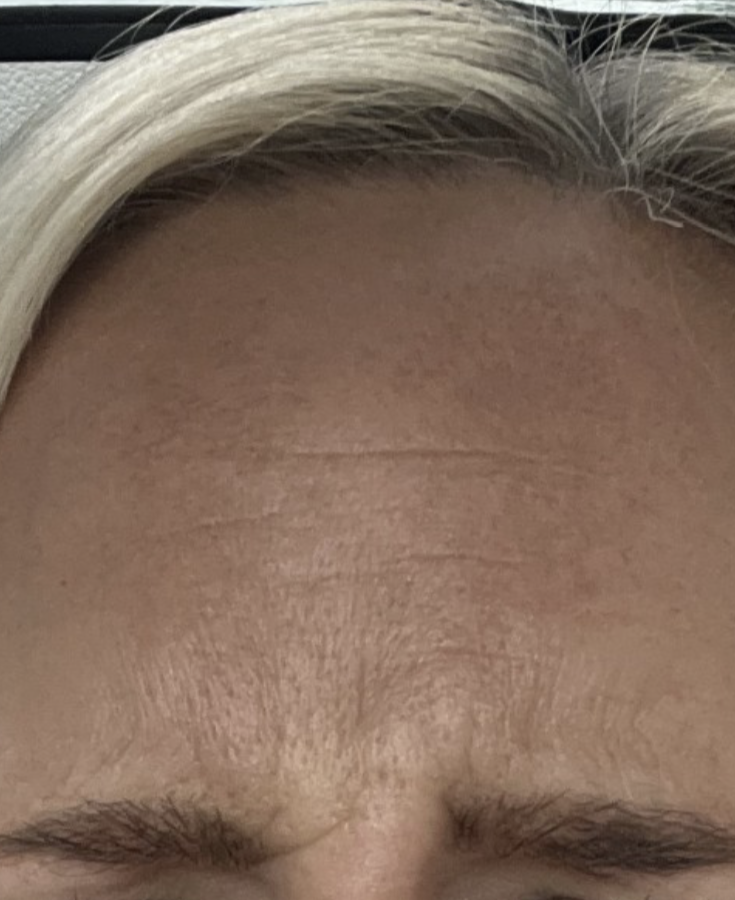 Two areas of anti-wrinkle. She didn’t like forehead lines. One faint static line left but this will fade after a few sessions.